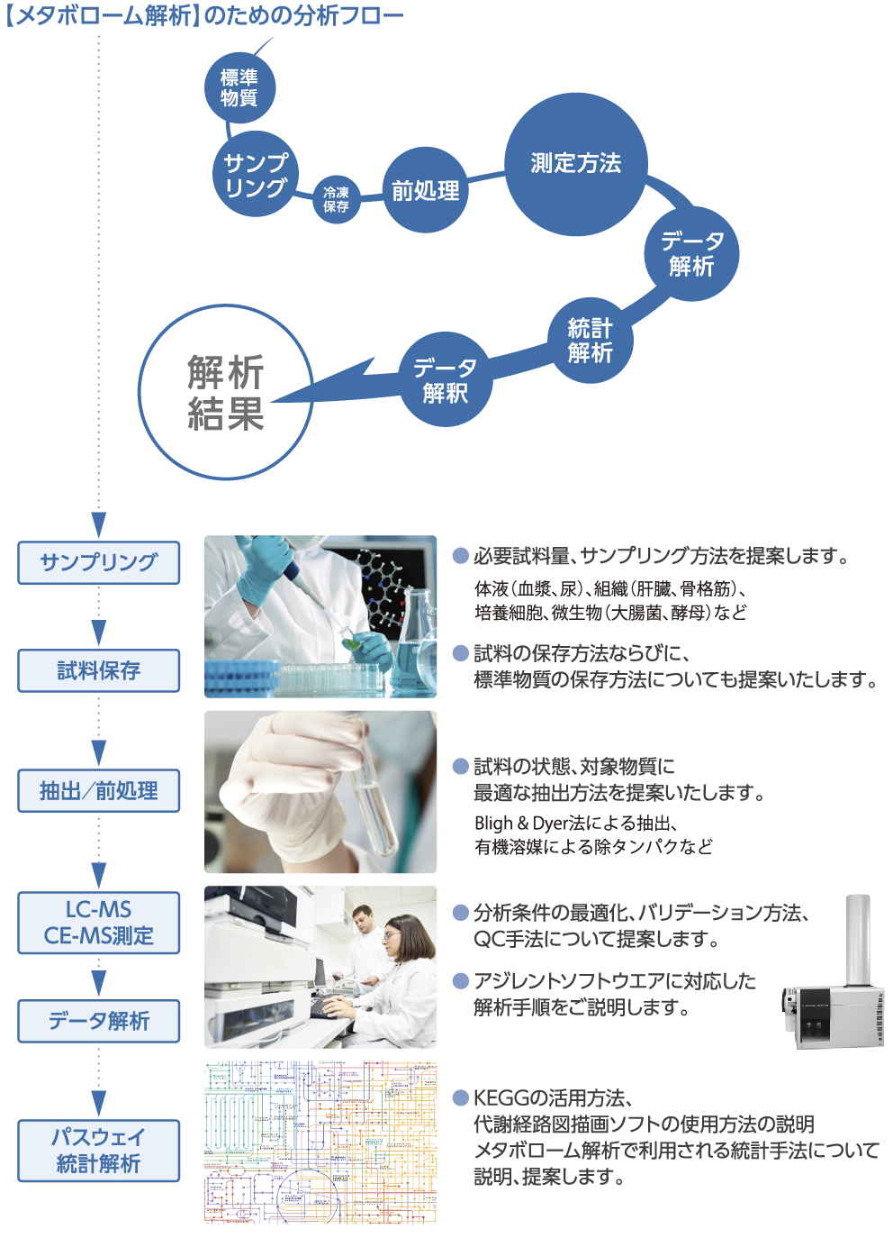 弊社分析者が、お客様の施設、設備を利用し、生体試料(血液や肝臓組織、培養細胞など)の抽出前処理からCE/MS, LC/MSなどで検体を測定しデータを取得します。その後データ解析、統計解析などを行ない、メタボローム解析結果を報告します。